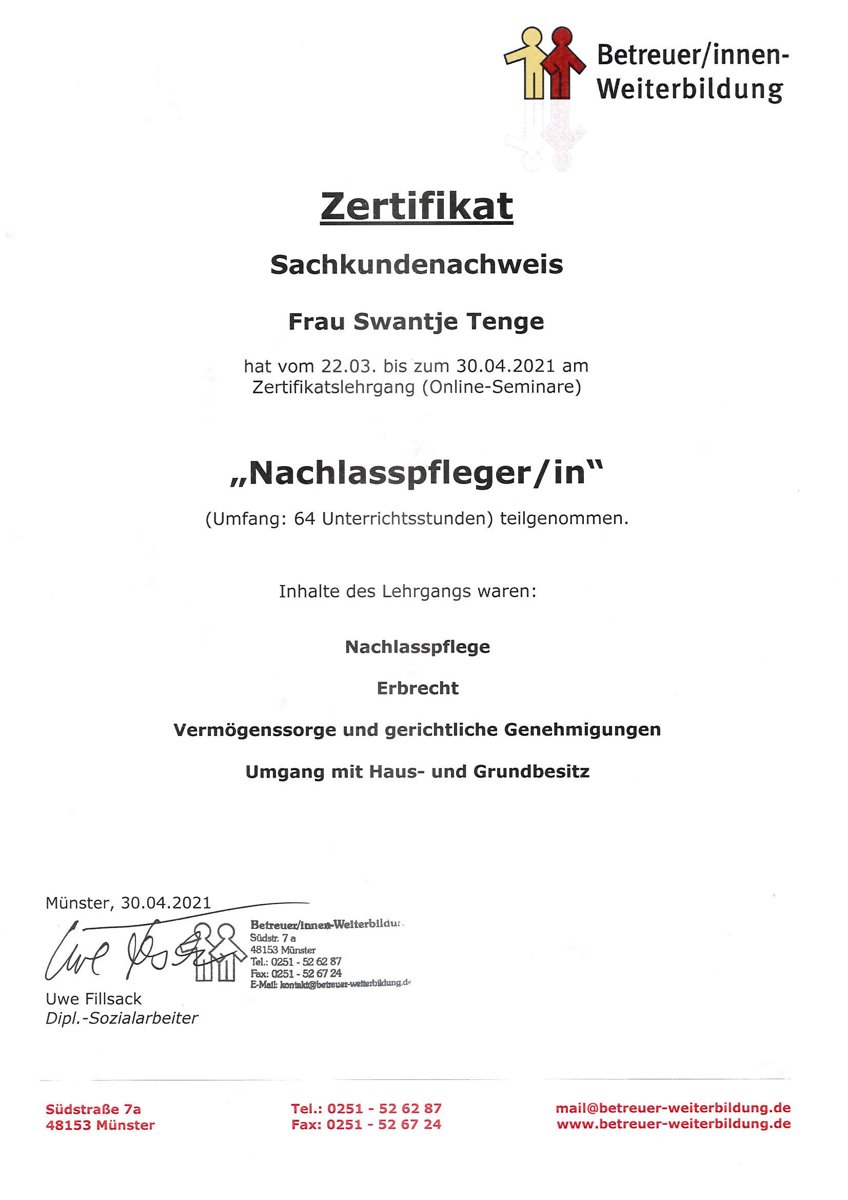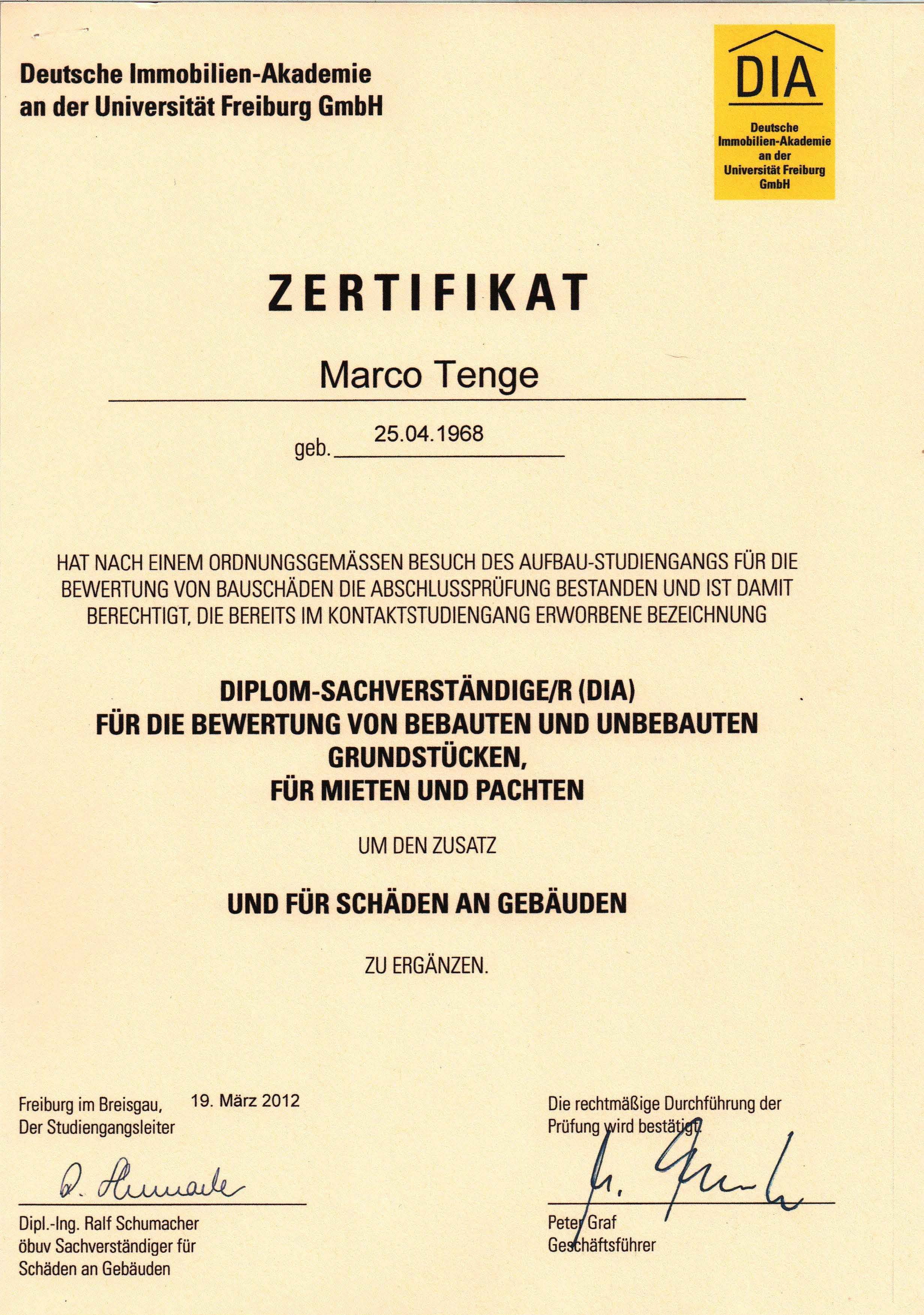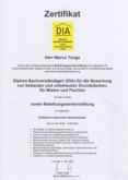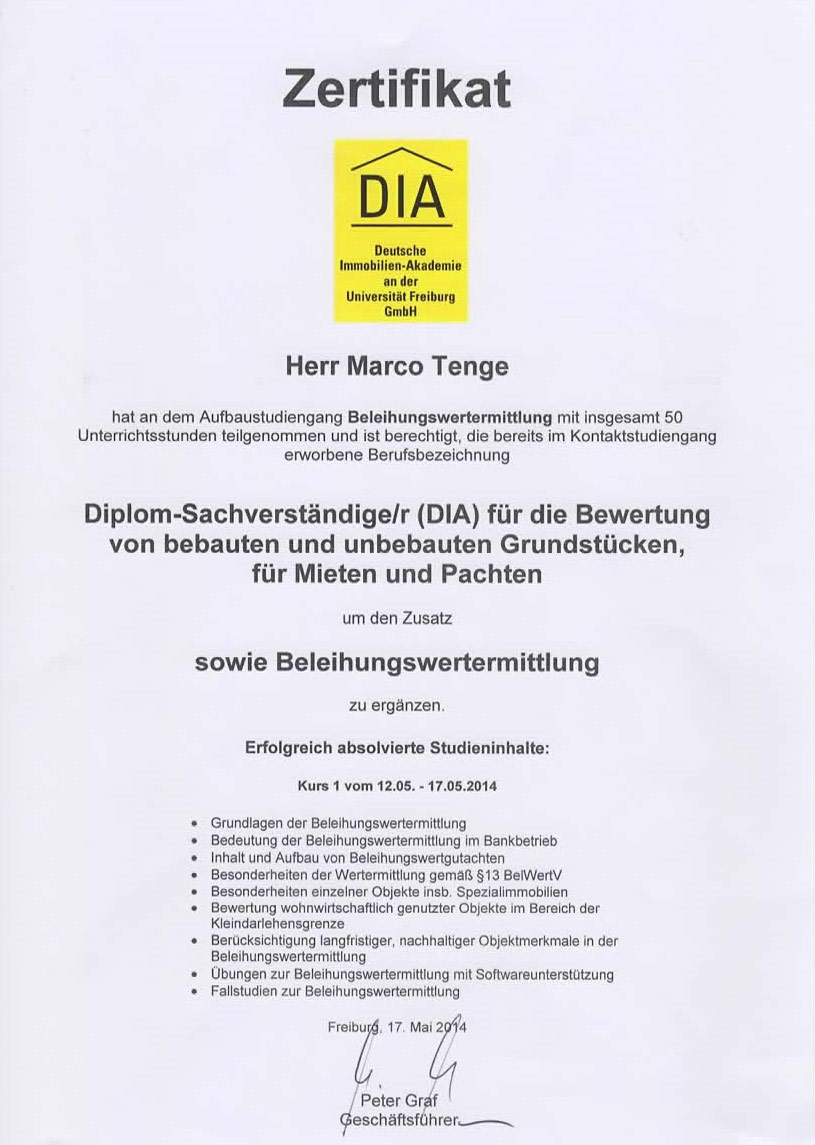 Diplom-Sachverständiger (DIA an der Universität Freiburg) für die Bewertung von bebauten und unbebauten Grundstücken, für Mieten und Pachten