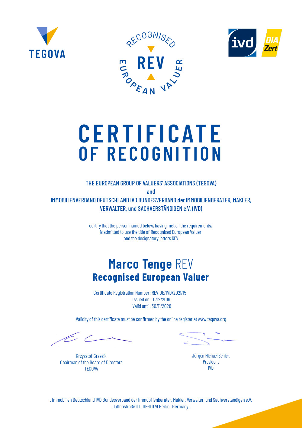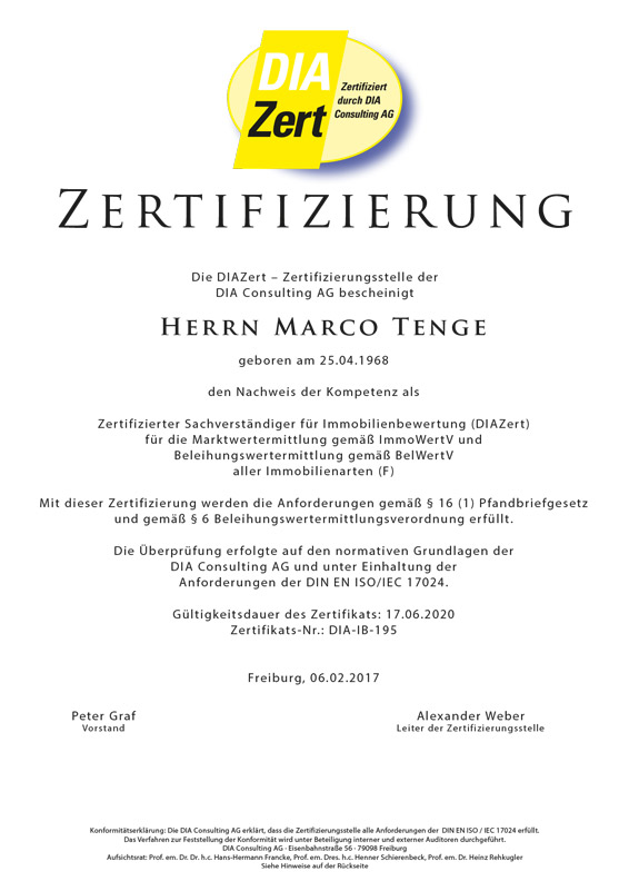 Zertifizierter Sachverständiger für Immobilienbewertung (DIAZert) für die Marktwertermittlung gemäß ImmoWertV und Beleihungswertermittlung gemäß BelWertV aller Immobilienarten (F) nach DIN EN ISO/IEC 17024