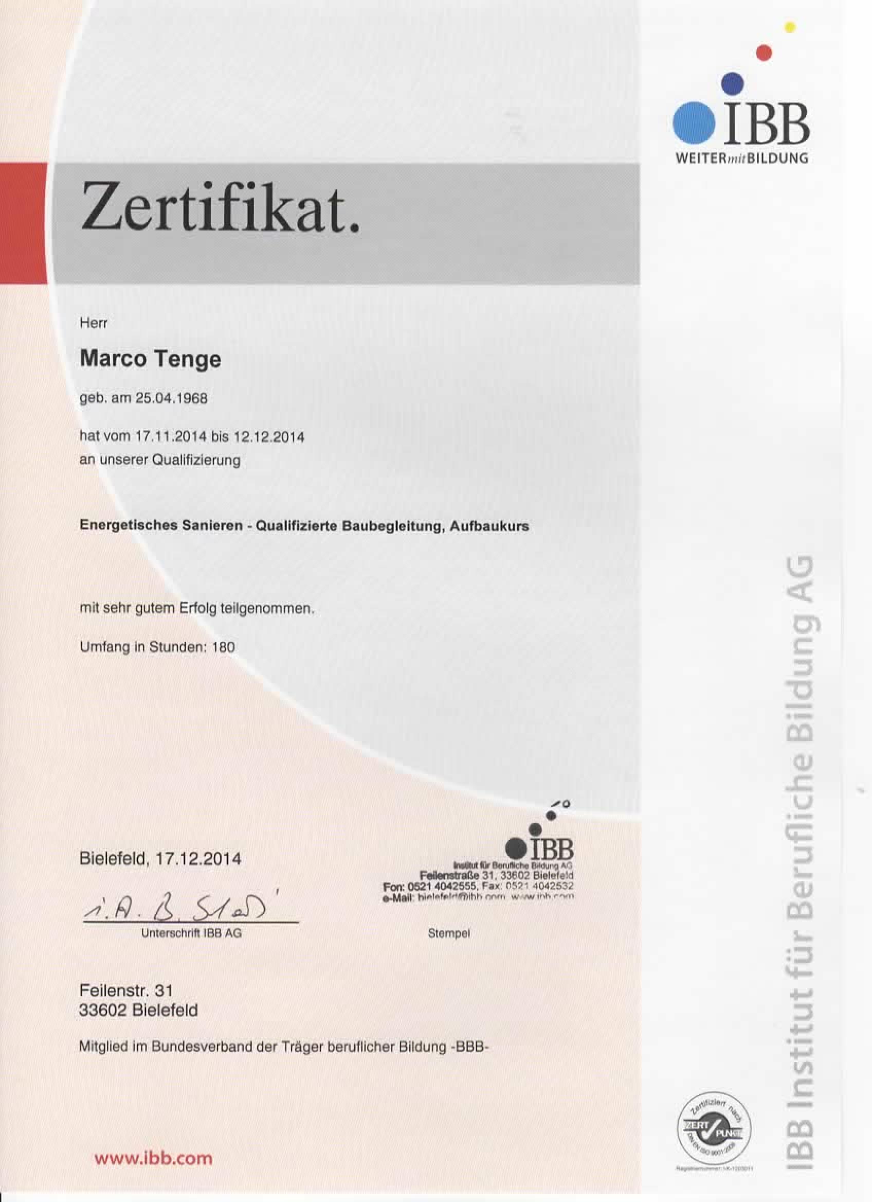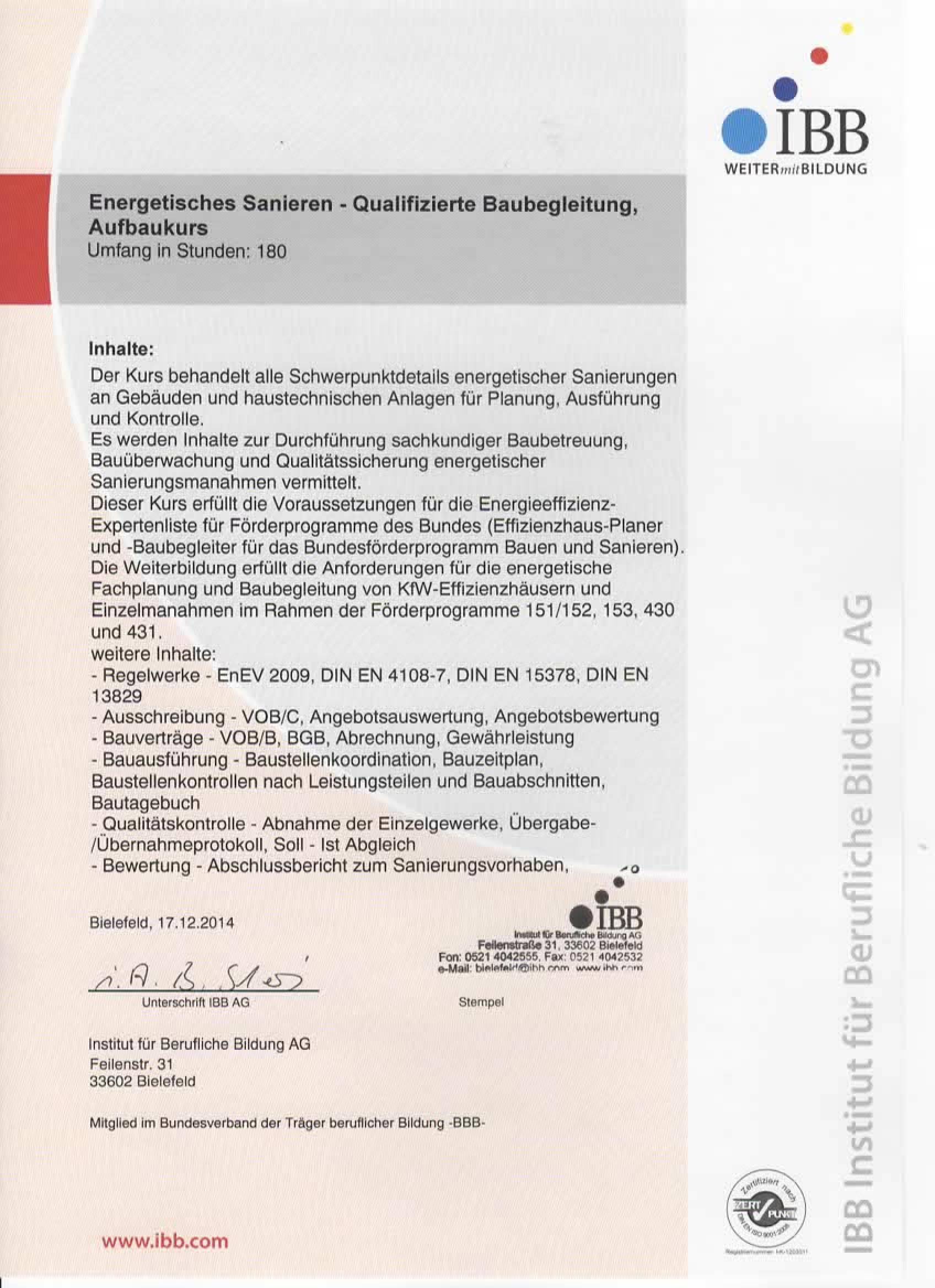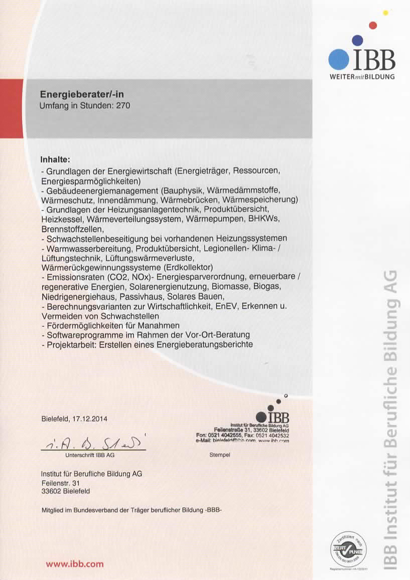 Energieberater (IBB) für Wohn- und Nichtwohngebäude sowie für Modernisierungen und Sanierungen im Bestand